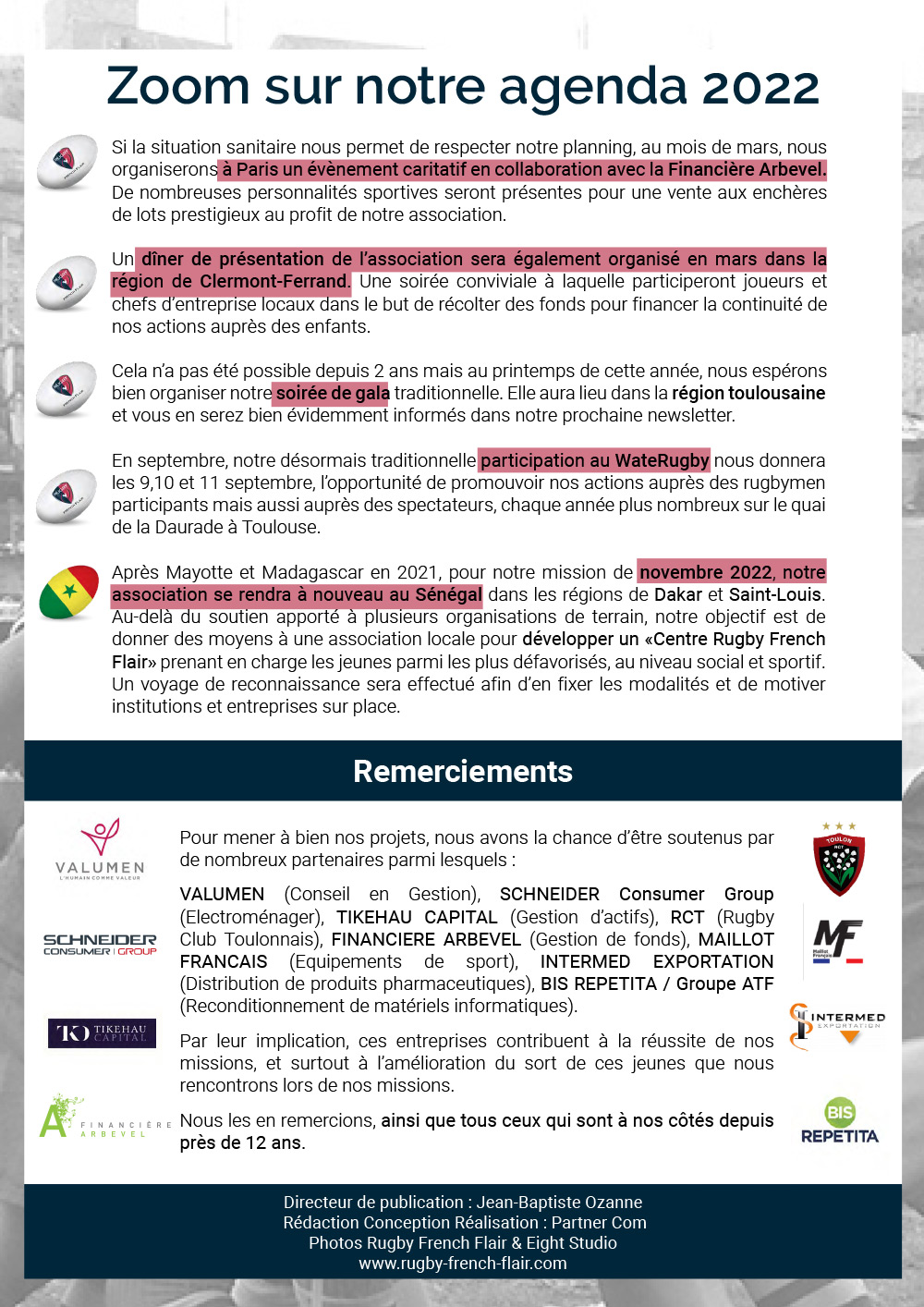 La newsletter Rugby French Flair regroupe nos dernières actualités et les derniers évènements liés à la vie de l'association, aux joueurs et aux partenaires qui œuvrent pour que cette belle aventure continue et pour encore, "partager les valeurs du Rugby au delà des frontières".