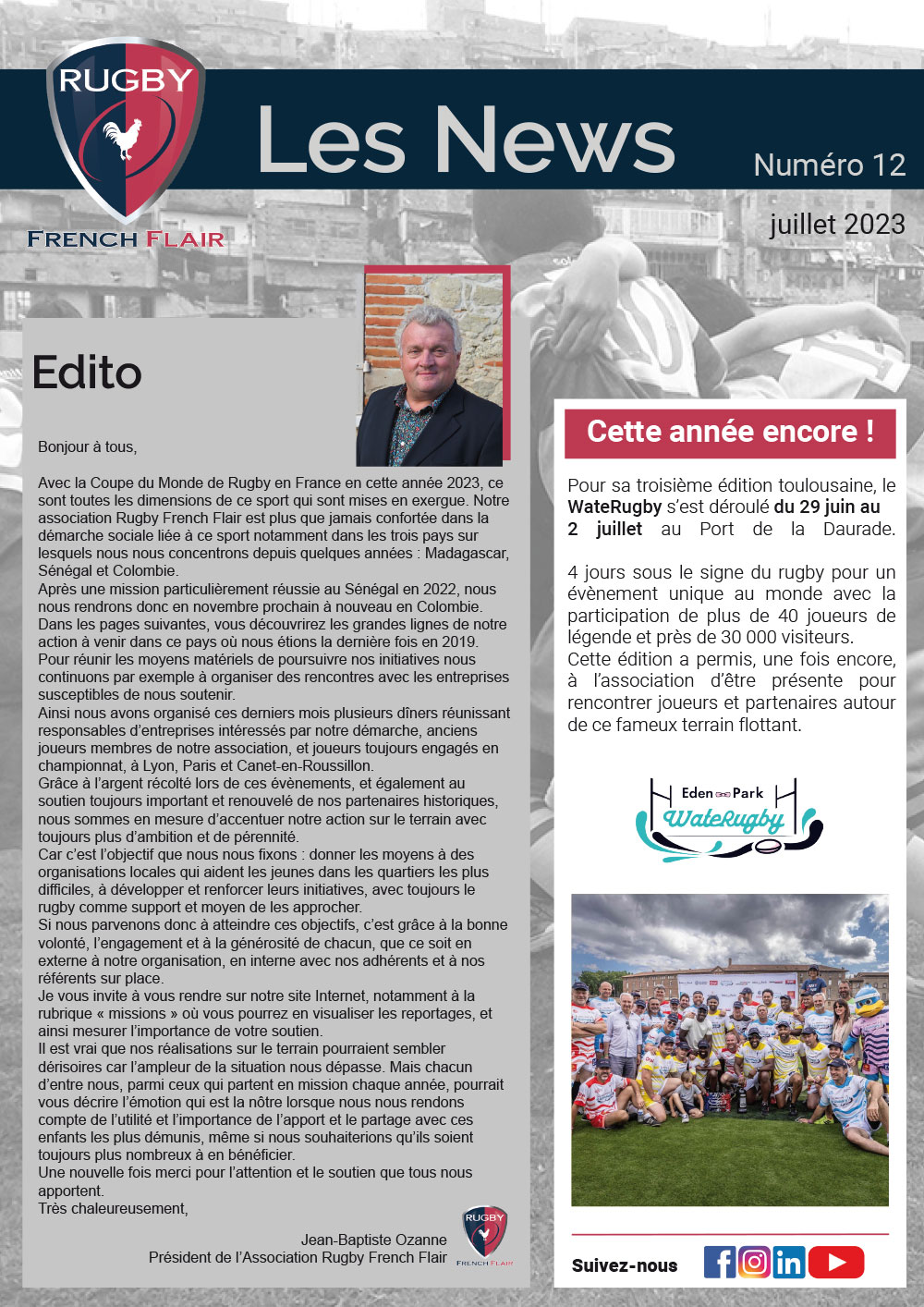 La newsletter Rugby French Flair regroupe nos dernières actualités et les derniers évènements liés à la vie de l'association, aux joueurs et aux partenaires qui œuvrent pour que cette belle aventure continue et pour encore, "partager les valeurs du Rugby au delà des frontières".