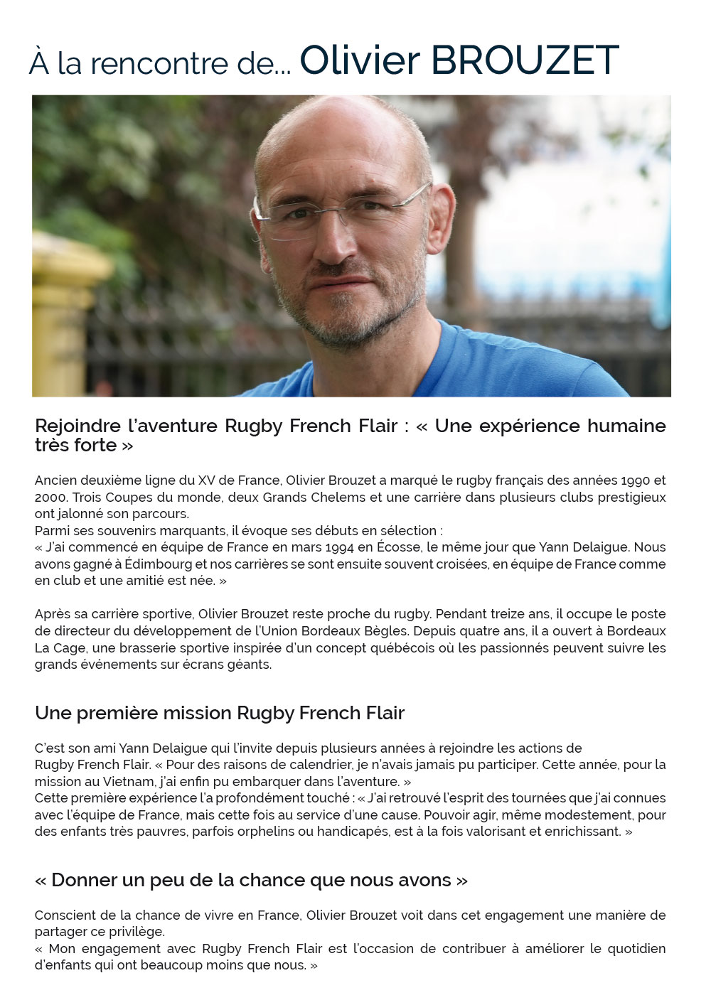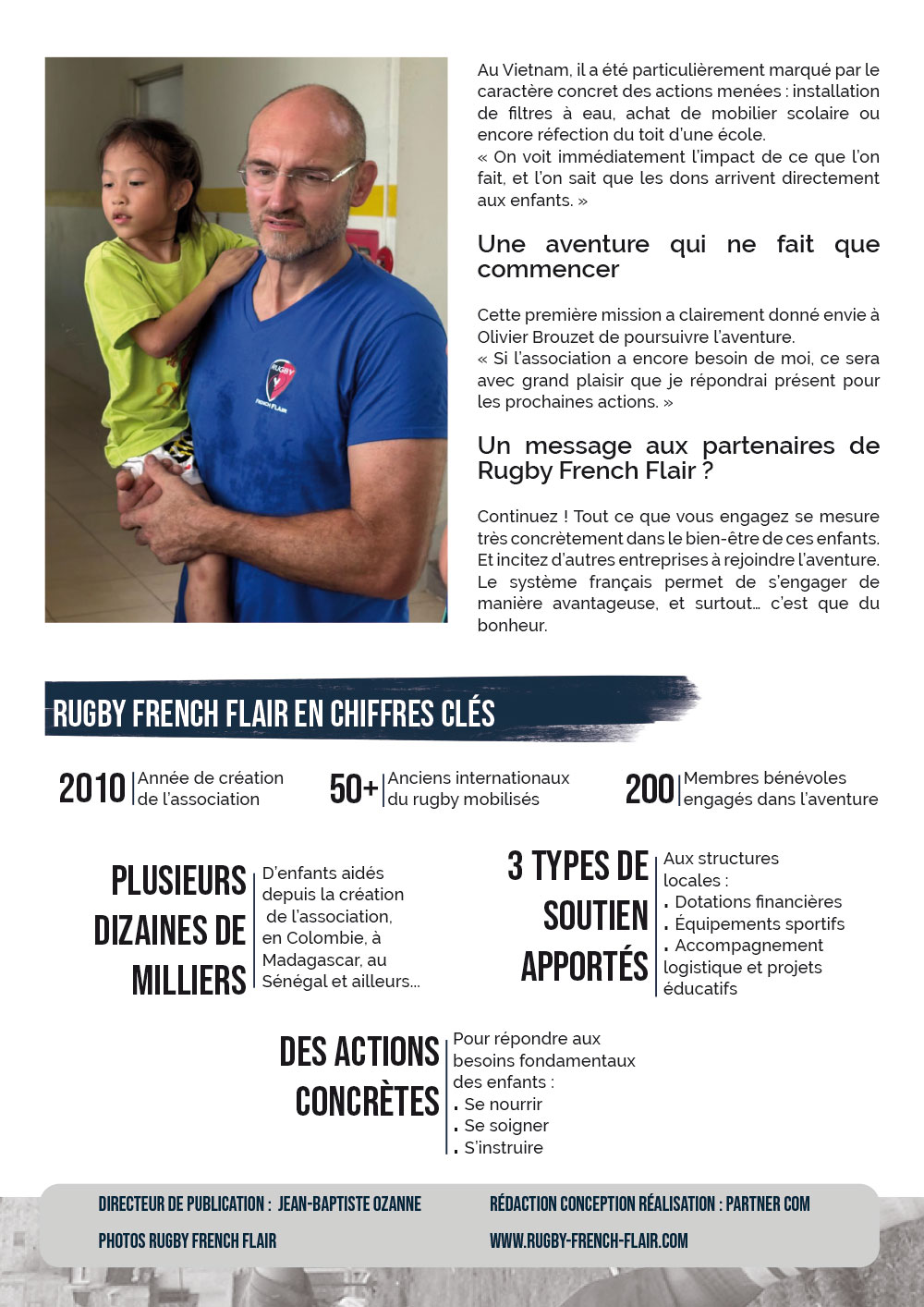 La newsletter Rugby French Flair regroupe nos dernières actualités et les derniers évènements liés à la vie de l'association, aux joueurs et aux partenaires qui œuvrent pour que cette belle aventure continue et pour encore, "partager les valeurs du Rugby au delà des frontières".